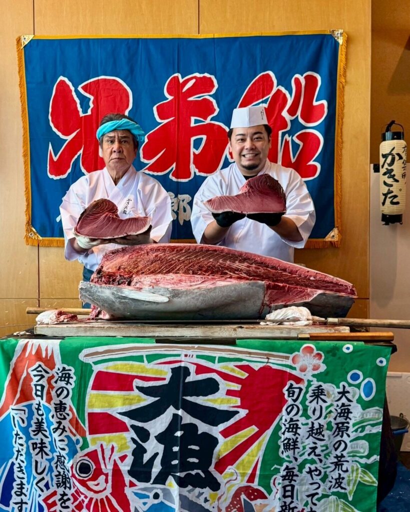 なんと、元・マグロ漁師として知られる鳥羽一郎氏ご本人が解体に参加し、ご自身の手でマグロをさばくというサプライズ演出が実現しました。