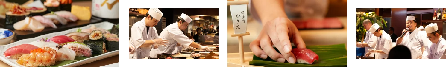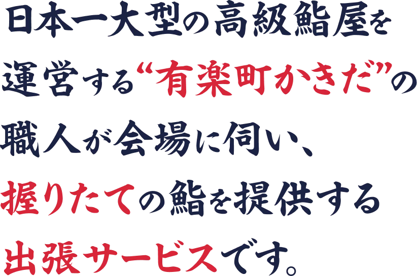 予約困難店"有楽町かきだ"の職人が会場に伺い、握りたての鮨を提供する出張サービスです。