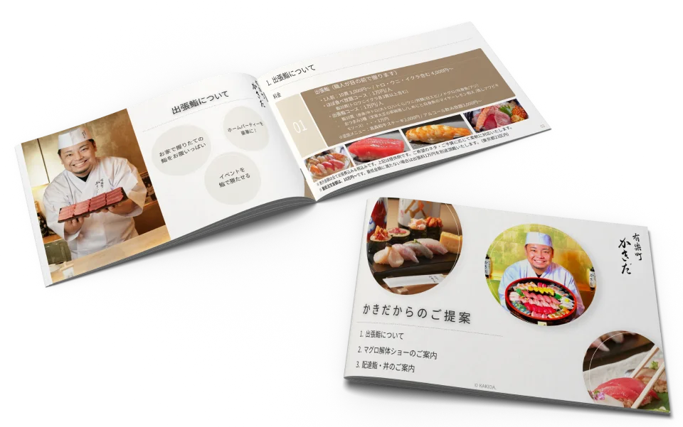 人数とメニューに合わせた分かりやすい料金体系で、初めての方でも依頼しやすい明朗会計。鮨ネタ・職人数・演出有無などを組み合わせて最適なプランをご提案します。